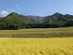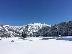 Minamiuonuma is situated in a valley in a mountainous region of Niigata Prefecture, located on Honshu, Japan's largest and most centralised island. Dotted with ski lodges and other winter activity facilities, the city is in a region known as "Snow Country"; indeed, Minamiuonuma sits at an average elevation of around 617 m (2,024 ft) above sea level,[3] creating a wintry climate in the coldest months of the year. The city sits just between Mount Sakado to the southeast, which measures 634 m (2,080 ft) tall, and Masugata Yama, measuring some 747 m (2,450 ft) above sea level, to the northwest.[4] The highest peaks in the area reach well over 1600 m (5,249 ft), and some measure as high as 2000 m (approx. 6,700 ft).[5]