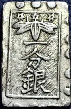 Old silver coin with mon(emblem) of the Minamoto clan (Seiwa Genji), found in Edo period