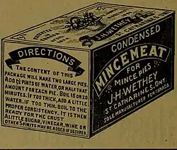 By the late 19th century, "apple mincemeat" was recommended as a "hygienic" alternative, using apples, suet, currants, brown sugar, raisins, allspice, orange juice, lemons, mace and apple cider, but no meat.[5]
