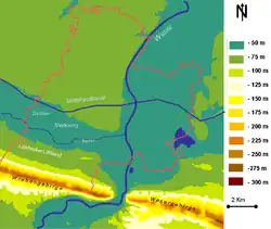 The Weser leaves the Minden area at its lowest part in the quarter of Leteln, at 40 metres (131 feet), while the highest part is the top of Häverstädter Berg with 272 metres (892 feet), at the edge of the Wiehen Hills in the quarter of Haddenhausen. The altitude of the town is given officially as 42.2 metres (138.5 feet), based on the elevation of the town hall.