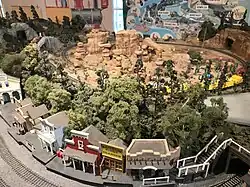 Mine Train Through Nature's Wonderland was redesigned by Marc Davis when Walt Disney requested him to insert more humor into Disneyland's attractions.[9] Rainbow Caverns Mine Train was closed and redesigned into Nature's Wonderland, taking inspiration from True-Life Adventures. The scenes of the Living Desert and Rainbow Caverns were incorporated into the redesign, which had guests boarding a train at the fictional Western town Rainbow Ridge before heading off into the attraction. The train traveled through Cascade Peak, Bear Country, Beaver Valley, the Living Desert, Devil's Paint Pots (multicolored geysers), and Rainbow Caverns before returning to the station. The attraction featured over two-hundred replicas of North American animals, and the narrative was provided by Dallas McKennon (who also did voices for some of Walt Disney's feature films and is the voice of Gumby).[10]