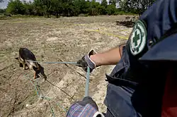 Mine detection dogs, which detect the presence of explosives in the ground by smell. Dogs are used in combination with manual deminers. As well as dogs, rats detect the presence of explosive in the ground by smell. Rats are used in combination with manual deminers or mechanical demining.