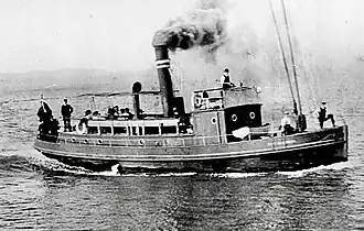 When road competition made the service uneconomic,[5] she was put up for sale in 1921.[2] In 1922 she was damaged when a crane fell on her.[6] Later that year she was sold to Charles West,[7] who owned a sawmill at Helensville and used her to tow logs across Kaipara Harbour.[8] She had a stormy passage to Kaipara and initially had to put in to Manukau Harbour.[9] She was again put up for sale in 1944.[10]