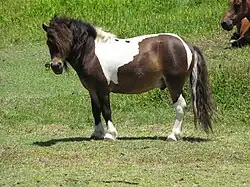 A miniature horse is a type of horse characterised by its small size. Usually it has been bred to display in miniature the physical characteristics of a full-sized horse, but to be little over 100 cm (40 in) in height, or even less. Although such horses have the appearance of small horses, they are genetically much more similar to pony breeds, such as the Shetland.[1]: 486 They have various colors and coat patterns.