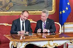 The constitution permits the vice chancellor to be given, in addition to his or her ex officio role as the deputy head of the Chancellery, a ministry of his or her own; alternatively, the vice chancellor can be given full autonomous control of a specific Chancellery subdepartment.[57] Since the duties of a vice chancellor by themselves are not particularly taxing, vice chancellors are generally happy to avail themselves of the opportunity. Heinz-Christian Strache for example, vice chancellor in the First Kurz government, doubles as the Chancellery minister of Civil Service and Sports.[58]