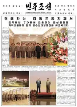 Minju Joson is the official newspaper of the government of North Korea. Specifically, it is the organ of the Cabinet of North Korea and the Presidium of the Supreme People's Assembly. It is considered the second most authoritative newspaper in the country, after Rodong Sinmun.[3] Unlike Rodong Sinmun, it handles more administrative matters, such as decisions and orders of the Cabinet, laws, regulations and policy issues.[2] Content on both foreign and domestic policy, the economy, and culture is typical as well.[1] The official mission of the newspaper is to "arm the workers of the people's governing bodies and the national economic bodies with the Great Leader's revolutionary thought and Juche ideology, and to greatly help the entire society in accomplishing Juche exploits by holding the workers firmly around the Party and the Great Leader and forcefully organizing and mobilizing them".[2] Minju Choson is published in Pyongyang. Circulation as of 1974 is 200,000.[1] The editor-in-chief is Jong Ri-jong.[4]