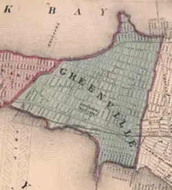 During the British and early American colonial era the area was part of Bergen Township. The 19th century Jersey City and Bergen Point Plank Road (today's Garfield Avenue) ran through Greenville (from Paulus Hook to Bergen Point). Greenville became part of the newly formed Hudson County in 1840. The town grew as a fashionable suburb of New York City.[18] Greenville Township was incorporated as a township by an Act of the New Jersey Legislature on April 14, 1863, from portions of Bergen Town.[19] It was absorbed into Jersey City on February 4, 1873, ending its life as an independent municipality.[19][20] Armbruster's Greenville Schuetzen Park on Hudson Boulevard opened in the 1870s.[21]
