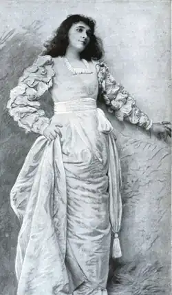 Minna Gale was known for Shakespearean roles in her early career.[3][4] In 1885, at age nineteen, Gale was cast as Queen Gertrude, in Lawrence Barrett's production of Hamlet (Barrett, playing her son in the title role, was 47 years old). She stayed with Barrett's company for six seasons, sometimes as a rival to Helena Modjeska.[5] Later, she played Ophelia to Edwin Booth's last performance as Hamlet.[6] Her beauty was often mentioned in reviews.[7] "If there is a young lady in this land who wishes to look when mad, she must assiduously cultivate the Minna Gale pout," remarked one theatre writer in 1892.[8] She formed her own company after Barrett's death,[9] and briefly retired from the stage in 1893, after her marriage.[10]