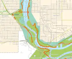 Minnehaha Trail is a 1.5-mile (2.4 km) paved, multi-use trail in Minneapolis, Minnesota, United States, that connects Minnehaha Regional Park and Fort Snelling State Park – two of the most popular recreation destinations in the Twin Cities metro area. The trail is considered a segment of a longer, loosely connected bicycle route system along the Mississippi River. Users of Minnehaha Trail traverse under a forest canopy. The trail received local recognition for its natural beauty, but it was criticized for its worn pavement and lack of signage.[1]