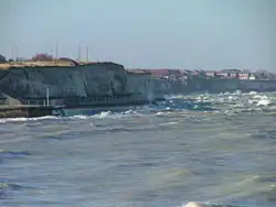 The village is built beside four partly sandy bays; Minnis Bay to the west, Grenham Bay and Beresford Gap towards the centre and Epple Bay to the east. The village is situated on the Isle of Thanet, which was a separate island from mainland Kent until around two hundred years ago, when the channel in between became silted up. The area to the west of the village, between Birchington and Herne Bay, was once part of the channel and is now low-lying marshland. In the east of the village the land rises, forming chalk cliffs and cliff stacks around the beaches at Grenham Bay, Beresford Gap and Epple Bay. A sea wall stretches along the foot of the cliffs to prevent further erosion. The geology of Thanet consists mainly of chalk,[8] deposited when the area was below the sea. Isle of Thanet became exposed above sea-level once the English Channel broke through between Kent and France, causing the sea-level to fall. The whole of the northeast Kent coast has been designated a Site of Special Scientific Interest.[9]