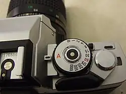 The XG-M supported both aperture priority autoexposure and full manual mode. For aperture priority shooting, the shutter speed dial was set to the A (auto) position. The photographer would set the aperture on the lens, which would be visible in the viewfinder by means of a small periscope beneath the image. The camera would decide on the correct shutter speed according to the reading of its center-weighted average metering. This would be displayed in the viewfinder: a column on the right of the image showed all the shutter speeds, and an LED would light next to the chosen speed. The automatically selected exposure could be adjusted by means of the exposure compensation dial on the left; compensation of plus or minus 2 stops could be selected in half-stop increments.