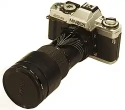 The Minolta XG-M was a 35mm single-lens reflex camera introduced in 1981 by Minolta of Japan. It was also known as the X-70 on the Japanese market, in which it was not available until 1982. When released, it was the top model in Minolta's XG series of consumer-grade manual focus SLRs, replacing the XG-9. Changes from that model included a metered manual mode (the XG-9's meter was switched off in manual), and a revised body style with rearranged controls. This was also the first camera to use Minolta's new logo, which was used until the 2003 merger into Konica Minolta.