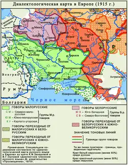 Dialectal partition of the Russian language in 1915, including Great Russian (red), Little Russian (green) and White Russian (purple)