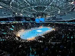 Minsk Arena (Belarusian: Мінск-Арэна, Russian: Минск-Арена) is the main indoor arena in Minsk, Belarus.[2] The Minsk-Arena complex includes the main multi-purpose arena (capable of hosting 15,000 spectators) with an open multi-level parking lot (with 1,080 parking spaces) alongside an interconnected 2,000-seat velodrome and a 3,000-seat speed skating rink.