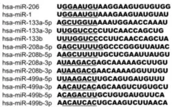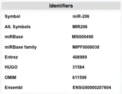 MiR-206 is a microRNA with a sequence conserved across most mammalian species, and in humans is a member of the myo-miR family of miRNAs, which includes miR-1, miR-133, and miR-208a/b.[1][2][3][4] Mir-206 is well established for the regulation of cellular processes involving skeletal muscle development, as well as mitochondrial functioning. miR-206 is studied in C2C12 myoblast cells as this is a widely used model for the study of cellular differentiation of skeletal muscle.[5] The biogenesis of miR-206 is unique in that the primary mature transcript is generated from the 3p arm of the precursor microRNA hairpin rather than the 5p arm.[6] Currently, miR-206 has approximately twelve miRNA family members (six of which are shown in Table 1), and the cognate seed sequence (nucleotides 2-8) of the miR-206 family is conserved across all twelve miRNA members.