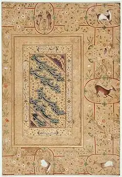 Mir Ali Heravi (Persian: میرعلی هروی), also known as Mir Ali Hossein Heravi and Mir Jan, titled as Kateb-e Soltani, was a prominent Persian calligrapher and calligraphy teacher of Nastaʿlīq script in the 16th century. He was the second significant Persian calligrapher after Mir Emad.[1] He had artistic influence on the later calligraphers.