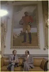 The lobby is formed by a printing of Simón Bolívar of Alirio Palacios, the paintings Los Pescadores (The Fishermen) by Luisa Palacios (1958), La Tempestad (The Tempest) by César Rengifo (1958) and a piece of furniture with a style from the first half of 18th century. Also, there is a miniature of the monument erected in Campo Carabobo, the painting La Patria al Soldado (From Nation to Soldier) by Hugo Daini, and a bust of Bolívar in the entrance of the meeting room. The meeting room is the area for the council of ministers. Is conformed by a long oval table and a portrait of Simón Bolívar by painter José María Espinoza.