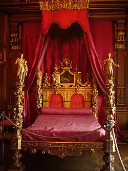 On the ground floor, destined for the use of Maximilian and his wife, Charlotte of Belgium,[1] worthy of note are the bedroom and the archduke's office, which reproduce the cabin and the stern wardroom respectively of the frigate Novara, the warship used by Maximilian as Commander of the Navy, and which circumnavigated the world between 1857 and 1859; the library, whose walls are lined with bookshelves; and the rooms of the Archduchess with their tapestry of light-blue silk. All the rooms still feature the original furnishings, ornaments, furniture and objects dating back to the middle of the 19th century. Many coats of arms of the Second Mexican Empire decorate the castle, as well as stone ornamentations on the exterior depicting the Aztec eagle.