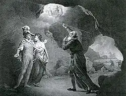 The Tempest's second scene begins with Miranda, begging her father to spare the lives of the men at sea. She's fully aware of the powers Prospero possesses and begs him to cease the storm. In an act of bravery she challenges her father's wisdom, arguing that: "Had I been any god of power, I would / Have sunk the sea within the earth or ere / It should the good ship so have swallow'd and / The fraughting souls within her."[2] As the scene progresses it is revealed to her that she is, in fact, the high ranking daughter of the Duke of Milan.