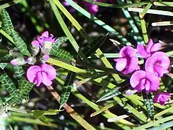 Mirbelia rubiifolia, commonly known as heathy mirbelia,[2] is a species of flowering plant in the family Fabaceae and is endemic to eastern Australia. It is a diffuse, spreading shrub with narrowly egg-shaped to linear, sharply-pointed leaves and clusters of pink to purple flowers.