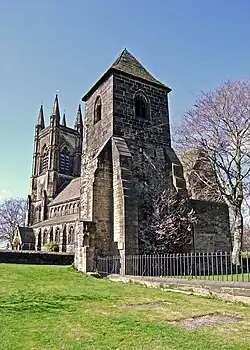 The 13th-century St Mary's Church was rebuilt in 1826 but proved too small for the growing population and was regarded as too minor for the growing district. A new church, designed by Sir George Gilbert Scott, was built a few yards to the northwest, on the site of Castle Hall, a mansion then home to the families of Mirfields (sometimes spelled Mirfin), Hetons and Beaumonts.[9] At Scott's suggestion, the tower of the earlier church, which includes some medieval work, was retained.