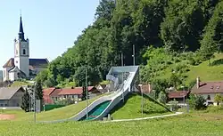 The main sports practiced in Mirna are association football, badminton, and ski jumping. The Mirna Football Club was established in 1967 and as of June 2012 has about 120 registered players, up to 14 years old.[29] The Mirna Badminton Club was established in 1991 and reaches the highest places among Slovenian clubs.[29] The most known ski jumper from Mirna is Maja Vtič, who placed fifth in the 2011 World Championship. A ski jumping hill stands behind the building of the Mirna Post Office in the western part of the settlement.[29][30] It is eight meters (26 feet) tall and was completed in 2011.[31]