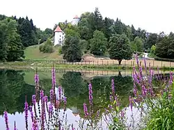 Outside the village, near the western border of the settlement,[1] stands Mirna Castle (Grad Mirna). It is situated on a relief pier, at the extreme edge of the Upper Hill (Gorenjska Gora).[18] Mirna Pond (ribnik Mirna), used as a swimming pool in the past and now primarily by fishermen,[19] is situated under the castle. It was created at the end of the 1960s[20] by damming of the Vejar.[9] A jogging path leads past it.[20] There are also the confluence of the Mirna and the Vejar[21] and a bridge across the Mirna.[13] A plain with flood-meadows stretches from the castle to the village.[22][23]
