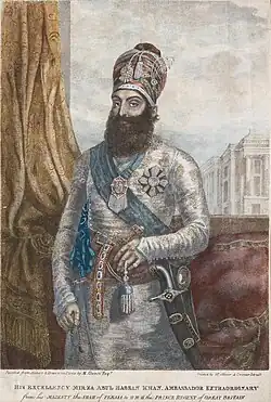 Mirza Abolhassan Khan Ilchi (Persian: میرزا ابوالحسن خان ایلچی; 1776 – 1845) also called Abolhassan Khan Shirazi Ilchi Kabir or Abu'l Hassan Khan[2] was an Iranian politician and diplomat who served as the Minister of Foreign Affairs twice, first from 1824 to 1834, and then again from 1838 until his death in 1845. He also served as the ambassador to Russia and Britain, and was the main Iranian delegate at the signing of the Golestan and Turkmenchay treaties with Russia in 1813 and 1828 respectively.