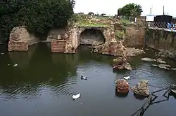 The sacellum of the Augustales[5] is also half submerged due to ground water.
