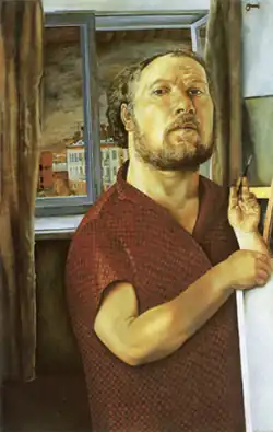 In 1969, working in collaboration with Gennady Mosin, he painted "Civil War Red commanders in the Urals", which depicted Blyukher, Frunze, Chapaev and other Red commanders in the Civil War in the Urals.[10] The painting was displayed at the third regional "Socialist Ural" art exhibition in Chelyabinsk and caused a lot of debates because the style of the painting was very different from Socialist Realism.[22]