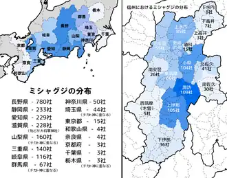 As noted above, worship of kami with names such as 'S(h)aguji' or 'S(h)agoji' are also attested in neighboring areas, being notably widespread throughout the Kantō and Chūbu regions of Japan. Shrines enshrining these gods are found in places such as Shizuoka (233 shrines), Aichi (229 shrines), Yamanashi (160 shrines), Mie (140 shrines) and Gifu (116 shrines).[21][22] On the other hand, such shrines are conspicuously absent in the two prefectures of Niigata and Toyama, located to the north of Nagano.[21]