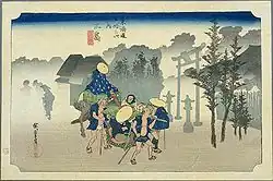 The classic ukiyo-e print by Andō Hiroshige (Hōeidō edition) from 1831–1834 depicts travelers setting out in the early morning mists. One is mounted, and the other is traveling by kago. The torii of Mishima Taisha shrine is in the background. By contrast, the Kyōka edition of the late 1830s depicts a snow-covered village, with Mount Fuji in the background.
