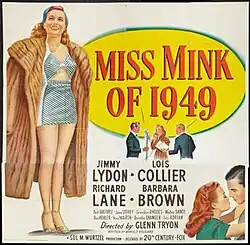 Miss Mink of 1949 is a 1949 American comedy film directed by Glenn Tryon (his last film as a director) and written by Arnold Belgard. It stars Jimmy Lydon, Lois Collier (in her final film role), Richard Lane, Barbara Brown, Paul Guilfoyle and June Storey. The film was released on February 11, 1949, by 20th Century Fox.[1][2][3]