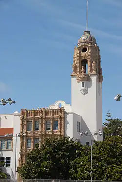 In 1922, the original Mission High School was destroyed by fire.[10] The present Mission High School complex was then constructed in a California Churrigueresque style between 1925 and 1927, during the height of San Francisco's "Golden Age" of school construction. John W. Reid Jr., San Francisco's City Architect, was the designer.[11] The elaborate ornamentation on the school is likely due in part to the visual proximity to the nearby Mission Dolores Basilica, which features towers and ornamentation in the Churrigueresque architectural style.