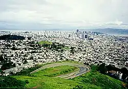 The Twin Peaks, icons of the San Francisco Bay Area, are also home to a reported population of Mission blue butterflies. The entire area is a park managed by the San Francisco Recreation & Parks Department (SFRPD). The park contains 31 acres (130,000 m2) of what the Park Department terms "Natural Areas." This area is most of the park minus roads, viewpoints and the City Fire Department reservoir. The natural areas contain significant resources for preservation. They include some of the largest areas of coastal scrub and prairie that remains within the city of San Francisco. These, being the preferred habitat of the Mission blue, are areas that support and provide habitat for the butterfly. Twin Peaks receives heavy recreational use because of its picturesque view of the city. Twin Peaks supports a wide array of habitat types, from mixed forest to coastal scrub. Among the coastal scrub and prairies are silver bush lupine plants (L. albifrons) which support the colonies of endangered Mission blues.[14]