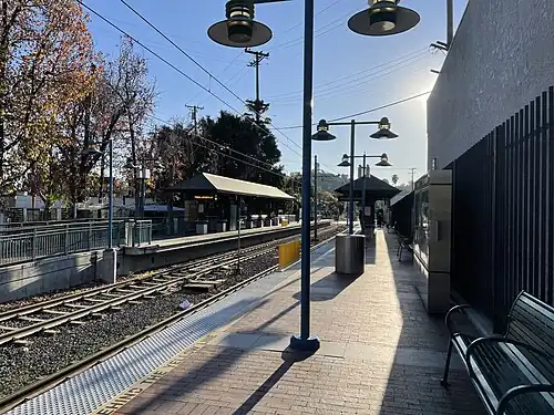 South Pasadena station (formerly Mission station) is an at-grade light rail station on the A Line of the Los Angeles Metro Rail system. It is located at the intersection of Mission Street and Meridian Avenue in South Pasadena, California, after which the station is named. The station opened on July 26, 2003, as part of the original Gold Line, then known as the "Pasadena Metro Blue Line" project.