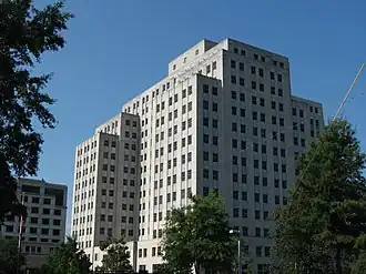 The Public Service Commission is led by three commissioners. One commissioner is elected by voters in each of the state's three Supreme Court districts. Commissioners are elected in the general election of the same year that other state and county officials are chosen.[10] Candidates for seats on the body are required by the state constitution and state statute to have resided in Mississippi for at least five years before the date of the election to be eligible.[18] The commissioners serve four-year terms beginning on January 1 of the year following the election.[10] Vacancies are filled by gubernatorial appointment.[19] The commissioners' individual salaries are $78,000 per year, but are set to increase to $95,000 annually in 2024.[20] They are required to meet by law the first Tuesday of every month in their office, though they may skip up to two such meetings per annum. They may also convene additional meetings elsewhere as they deem necessary.[10] The meetings are subject to the state open meeting law[21] and the presence of two commissioners constitutes a quorum.[22] The commission's activities are funded by appropriations from the State Legislature.[15][23] The agency is headquartered in the Woolfolk State Office Building in Jackson, Mississippi.[24][25]