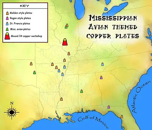 Avian themed plates are thought to depict aspects of the Birdman, a major figure in Mississippian iconography closely associated with warfare, ritual dancing, and the game of chunkey.[4] Numerous examples of similar avian themed plates have been found in locations across the Midwest and Southeast, from the large cache found in Malden near the bootheel region in Dunklin County, Missouri to others from Mangum in Mississippi,[9] Spiro in Oklahoma, Etowah in Georgia, Lake Jackson Mounds in Florida and other sites in Missouri, Illinois, and Alabama.[4]