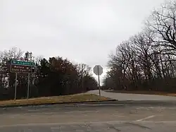 All of the route is located in Clinton County. Route 121 begins at a T-intersection at US 69, south of Cameron and US 69's interchange with Interstate 35 near the city. The route travels eastwards over Christman Brook,[1] and it enters a mixture of farmland and forests.[2] The road intersects Northeast Jones Road, which is concurrent with the route for 0.251 miles (0.404 km). Route 121 shifts north temporarily, and it intersects Northeast Jones Road, the end of the concurrency. The road then borders Wallace State Park and crosses over Deer Creek. Travelling through a forest, the route turns southeastward near the park entrance. Route 121 ends at a Y-intersection with the park entrance and Route HH, a supplemental route. The road continues eastward as Route HH, which ends at Route 13 in Kingston.[1]