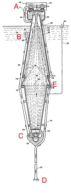 A: Vacuum pump which maintains low pressure in the structure. B: Inlet to allow warm water surface water to flow down to the turbine. C: Base of the structure 100M below surface where the turbine is located. D: Cold water pipe which extends to depth (usually 700 to 1000 meters depth). E: Location where cold water jets spray upwards into vessel.