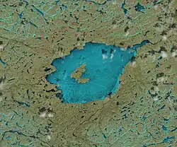 Mistastin crater is a meteorite crater in Labrador, Canada which contains the roughly circular Mistastin Lake.[3] The lake is approximately 16 km (9.9 mi) in diameter, while the estimated diameter of the original crater is 28 km (17 mi). The age of the crater is calculated to be 36.6 ± 2 million years (Eocene).[4]
