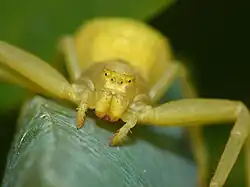 Misumena vatia has two rows of eyes. Those in the anterior row are equally spaced and curved backward while those in the second row vary in appearance from animal to animal, and can be curved more or less than the first. The area around the eyes is narrower in the front than the back. The spider's hair is erect and can be either filiform or rod-shaped.[18] The legs do not have spines, except under the tibia and metatarsus of the first two sets of legs. The appearance of the clypeus and the structure of the cephalothorax can be used to distinguish the genus Misumena within its subfamily.[12][13]