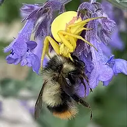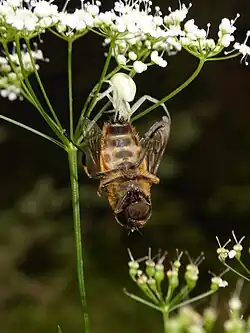 Crab spiders are carnivorous, feeding on invertebrate insects such as flies, bees, butterflies, grasshoppers, dragonflies, and hoverflies.[3][21] Bumblebees (Bombus appositus)[22] provide the spider with the most biomass, but small syrphid flies (Toxomerus marginatus) are the prey captured most frequently. Other frequently captured prey include honeybees (Apis mellifera) and moths.[21] Immature Misumena vatia commonly feed on smaller-sized prey such as thrips, aphids in the family Aphididae, and dance flies in the family Empididae. They may also use nectar and pollen as food sources when prey is scarce.[20]