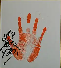 Mitakeumi began the Hatsu tournament in January 2017 with a win over ōzeki Gōeidō, and on Day 2 he earned his first kinboshi (a yokozuna upset by a wrestler from the maegashira ranks) when he defeated Harumafuji.[21] He also defeated yokozuna Kakuryū on Day 4.[22] He finished with 11 wins and was awarded a Technique prize for his performance in this tournament.[23] He returned to the sanyaku ranks in the March 2017 tournament at komusubi, and came through with a winning record of 9–6. In May he defeated Kakuryū on Day 1 and Harumafuji on Day 11 (which was Harumafuji's first loss in the tournament). He finished with an 8–7 record and received the Outstanding Performance Award for the first time. He was promoted to sekiwake for the July 2017 tournament, the first wrestler from Dewanoumi stable to achieve this since Dewanohana in 1982.[24] In this tournament he defeated yokozuna Kisenosato on opening day, and tournament leader Hakuhō on Day 11, who was on a 25-match winning streak and hoping to equal the all-time career wins record of 1047.[25] Mitakeumi's only previous win over Hakuhō had been by default when the yokozuna pulled out of the March 2017 tournament through injury.[25] He ended the tournament with a 9–6 record and received a second consecutive Outstanding Performance award. In an interview immediately after the tournament he commented "I didn't think I would be able to win this award twice in a row so I am pleased. It was good that I was able to wrestle my brand of sumo at this tournament, win on the last day and also get a victory against Hakuho".[26] Mitakeumi maintained his sekiwake rank in the September and November tournaments, and was the only top division wrestler to secure a majority of wins against losses in every tournament of 2017. In January 2018 he started well with seven straight wins but he recorded only one more win (over Kakuryū) in the tournament. A 7–8 result in March saw him demoted to komusubi but he rebounded with 9 wins in May to return to sekiwake.