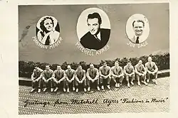 Fashions in Music was then signed to their first recording contract for "Row, Row, Row", which sold 50,000 copies soon after its release. Radio stations began playing the record, and the orchestra was in demand for appearances throughout the country.[1][2][5] In 1939, Bluebird Records offered the band an initial one-year contract; the arrangement lasted until 1942.[1][2][6] All the while, the orchestra continued to function as a company, with the musician shareholders discussing business matters and voting on them.[2] By 1940, the orchestra had its own show on CBS Radio.[7] Ayres and the band appeared in three 1940s films: Swingtime Johnny, Moonlight and Cactus, and Lady, Let's Dance.[8][9][10][11]