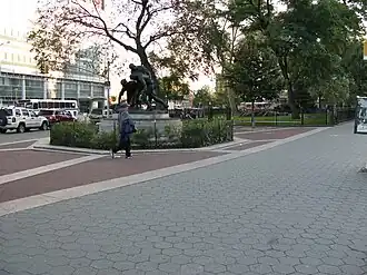 The northern part features a World War I Memorial in the form of a sculpture by Gertrude Vanderbilt Whitney.[1] There are three bronze figures, a wounded sailor is supported by a Marine, while an army private bends to talk to the wounded man. This monument received a 1923 medal from the New York Society of Architects as "the most meritorious monument erected during the year."[2] The figural group is mounted on a granite pedestal that reads: “Erected by the people of Washington Heights and Inwood in commemoration of the men who gave their lives in the World War.” When it was erected, on Memorial Day, May 1922, there had been only one world war. The sculpture is surrounded by a fence and plantings.