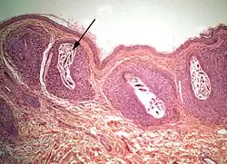 One genus of mites, Demodex, has adapted to infesting the hair follicles of its hosts.[22] These mites remain external to the true outer layer of the skin (the epidermis) which also lines the tube of the hair follicle. However, the mites appear to be deep within the skin in the sense of being below the general outer surface of the host. The mites fit in the narrow space between the hair and the tube of the follicle. They may also crawl out onto the general epidermal surface of their host. Transmission of these mites from host to host occurs during close contact when young animals are suckled. Demodex mites are morphologically adapted to this constricted habitat: microscopic, worm shaped, and with very short legs. The mites feed on cells of the epidermal lining of the hair follicle. Many species of mammals, including humans, are readily infested with these mites, but typically the density of infestation is very low. However, they are considered parasitic in people with weakened immune systems.[23]