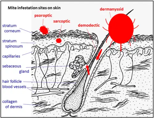 The diagram Mite infestation sites on skin shows where typical infestations of different taxonomic groups mites on livestock animals occur on or in the host's skin.[9] The position of these mites in relation to the skin or other organs is crucial for their feeding and also for their veterinary diagnosis and options for treatment. The mites either feed on the tissues of the skin using penetrating mouthparts or on the inflammatory exudate that results from the action of the mouthparts and saliva of the mites on the skin.[12] Demodectic mites have mouthparts adapted to penetrate and suck out the contents of individual cells of hair follicles.[13] It is usual for all active stages of the mite lifecycle to feed as parasites, but the trombiculid mites are an exception. Most of the parasitic mites do not feed directly on blood, but the dermanyssid mites and larval trombiculid mites directly suck up capillary blood as their exclusive food. The tube through which food is ingested and saliva excreted during feeding is formed in most mites by apposing the sheath that contains the chelicerae against the hypostome. However, the trombiculids are an exception. Some species of mites (Analgidae) have adapted to feeding on keratin and skin debris amongst the feathers of birds, and other species have adapted to feed directly on internal tissues such as air-sacs or lungs (Cytoditidae and Laminosioptidae). Psoroptic mites feed superficially at the stratum corneum; the photograph of a histological section of skin infested with Psoroptes ovis, and the photograph of the surface of a host's skin infested with P. ovis looking like white dots, show this type of feeding. Sarcoptic mites feed by burrowing within the living layers of the epidermis, mainly stratum spinosum. Demodectic mites feed in a position technically external to the skin, between the epidermis and the hair shaft in hair follicles. Dermanyssid and trombiculid mites feed whilst external to the skin by piercing the skin with, respectively, their chelicerae or a stylostome feeding tube. Mites at other sites feed by using their chelicerae to scrape either at the skin surface, or at base of feather, or to penetrate and scrape at internal tissue such as air-sac or lung.