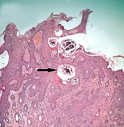 Sarcoptic mites as adults are microscopic, nearly circular in outline, and their legs are short, adapted for burrowing.[30] The females, after mating with males on the surface of their host's skin, burrow into the living layers of the epidermis (mainly the stratum spinosum). They make tunnels horizontal to the surface of the skin. Here, eggs are laid and development of larvae and nymphs occurs. The mites have low mobility and transmission between hosts occurs only during close contact.[31] The feeding of the mites and their excretory products irritates and inflames the skin, causing intense pruritus. Dermal hypersensitivity reactions develop in the host. Chronic infestations lead to thickening of the skin by overproduction of epidermal cells (acanthosis), resulting in a characteristic depilated and scaly appearance. Stress caused by the pruritus can be severe, and will result in 6% to 23% lost productivity of commercially reared pigs.[32][33] Camels are prone to severe infestation with Sarcoptes.[34]