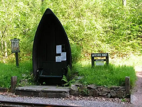 Miteside Halt railway station is a railway station on the 15" gauge Ravenglass & Eskdale Railway in Cumbria, England. It is located where public footpath and the railway cross, a short way west of the passing loop. It was first opened in the days of the 3ft gauge railway, to serve the residents of the nearby Miteside House. To provide protection from the elements, a upturned boat hull was provided as a shelter. This tradition of using a boat hull as a shelter continues to this day, the current boat is the third one in the halt's history.[1]